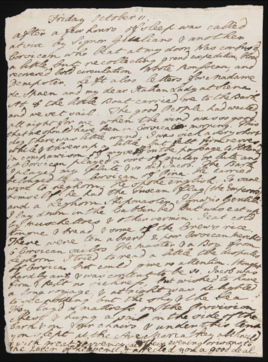 Lorsque je suis arrivรฉ en Suisse, je suis allรฉ voir M. Rousseau. J’avais entendu dire que M. Rousseau avait entretenu une correspondance avec les Corses, et qu’on lui avait demandรฉ de les aider ร รฉlaborer leurs lois. J’ai insistรฉ pour qu’il me donne une lettre d’introduction, ce qu’il a acceptรฉ de faire car il a vu que mon enthousiasme pour les braves insulaires รฉtait aussi chaleureux que le sien.